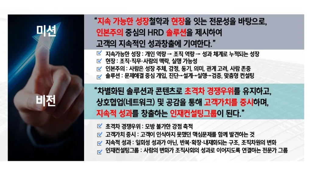인본주의 중심의 차별화된 HRD 솔루션을 통해 고객가치와 지속적 성과를 창출합니다.”